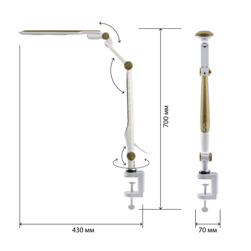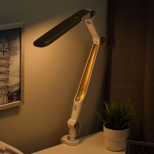 Настольный светильник ЭРА NLED-496-12W-G со светодиодами (LED) в качестве источников света. Оснащен сенсорным управлением с возможностью выбора цветовой температуры (теплый, нейтральный или холодный свет). Плавный диммер для регулировки яркости. Светильник сохраняет выбранные настройки при включении-выключении. Высота плафона регулируется двухсекционной сгибающейся стойкой, направление света регулируется поворотом и наклоном плафона в любую сторону. Удобное крепление на струбцину.