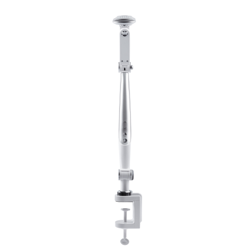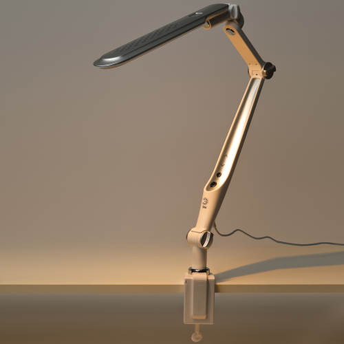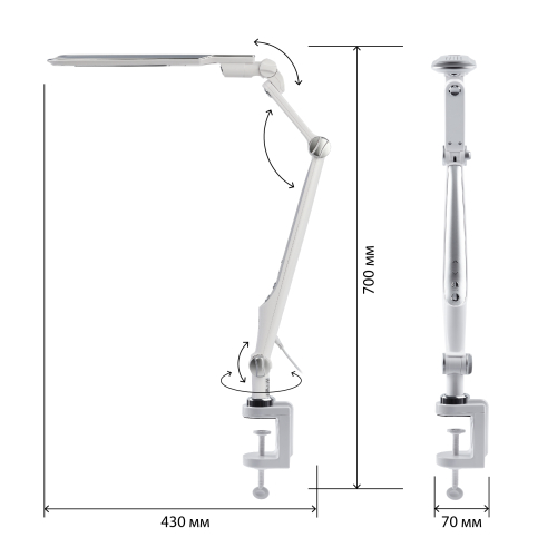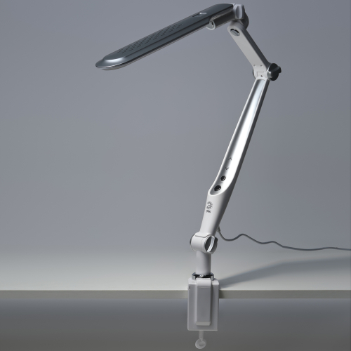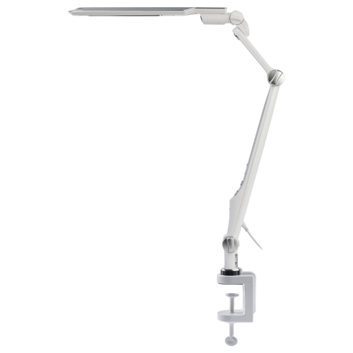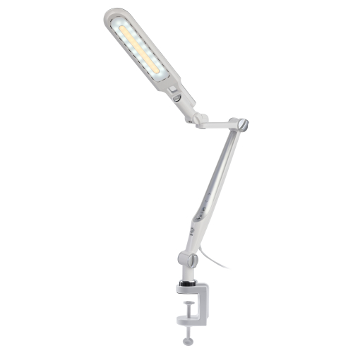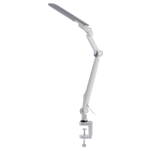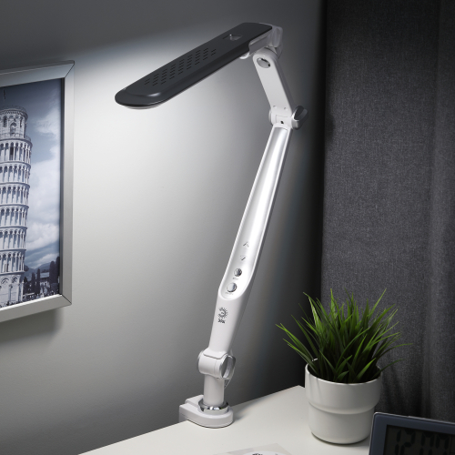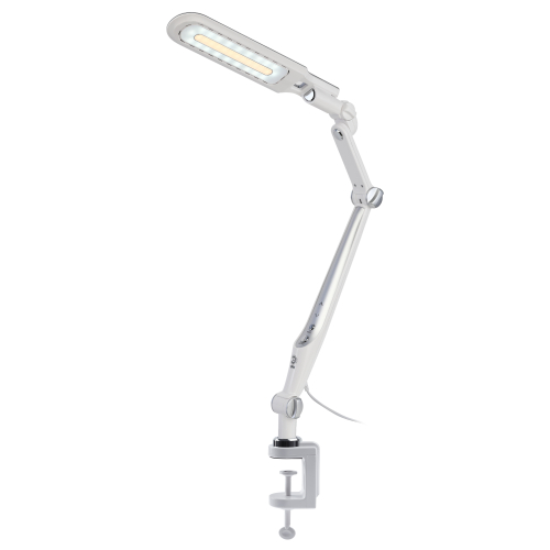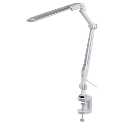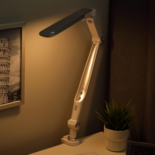 Настольный светильник со светодиодами (LED) в качестве источников света. Выбор цветовой температуры - 3 цвета: 3000К, 4500К, 6000К. Сенсорный переключатель на стойке. Плавный диммер для регулировки яркости. Светильник сохраняет выбранные настройки при включении-выключении. Высота плафона регулируется двухсекционной сгибающейся стойкой, направление света регулируется поворотом и наклоном плафона в любую сторону. Модель на струбцине.