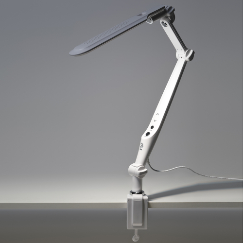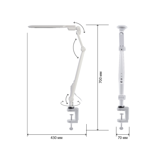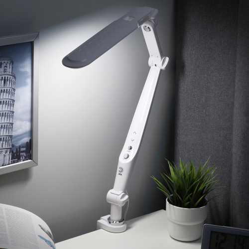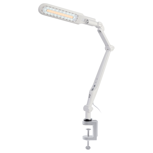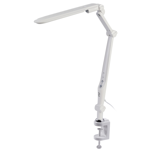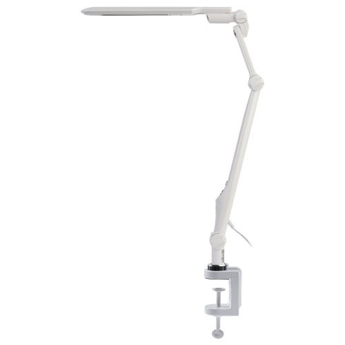 Настольный светильник со светодиодами (LED) в качестве источников света. Выбор цветовой температуры - 3 цвета: 3000К, 4500К, 6000К. Сенсорный переключатель на стойке. Плавный диммер для регулировки яркости. Светильник сохраняет выбранные настройки при включении-выключении. Высота плафона регулируется двухсекционной сгибающейся стойкой, направление света регулируется поворотом и наклоном плафона в любую сторону. Модель на струбцине.