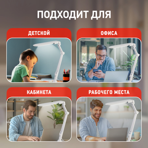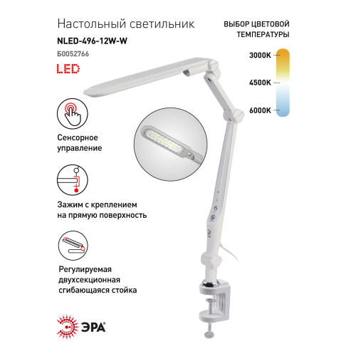 Настольный светильник ЭРА NLED-496-12W-W со светодиодами (LED) в качестве источников света. Оснащен сенсорным управлением с возможностью выбора цветовой температуры (теплый, нейтральный или холодный свет). Плавный диммер для регулировки яркости. Светильник сохраняет выбранные настройки при включении-выключении. Высота плафона регулируется двухсекционной сгибающейся стойкой, направление света регулируется поворотом и наклоном плафона в любую сторону. Удобное крепление на струбцину.