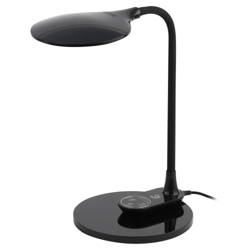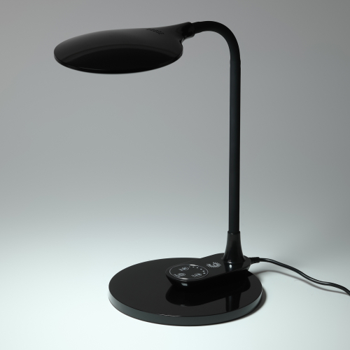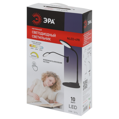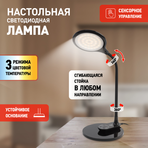 Настольный светильник ЭРА NLED-498-10W-BK со светодиодами (LED) в качестве источников света. Оснащен сенсорным управлением с возможностью выбора цветовой температуры (теплый, нейтральный или холодный свет). Плавный диммер для регулировки яркости. Светильник сохраняет выбранные настройки при включении-выключении. Направление света регулируется наклоном и поворотом плафона в любом направлении. Форма плафона в виде круга обеспечивает оптимальное рассеивание света и очень удобна при мелкой ручной работе. Светильник имеет съемное основание и возможность подвеса на стену. По вашему выбору можно использовать светильник как настольный с устойчивым основанием или как съемное бра.