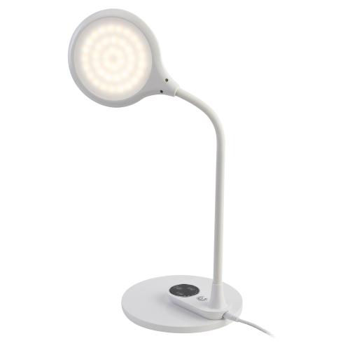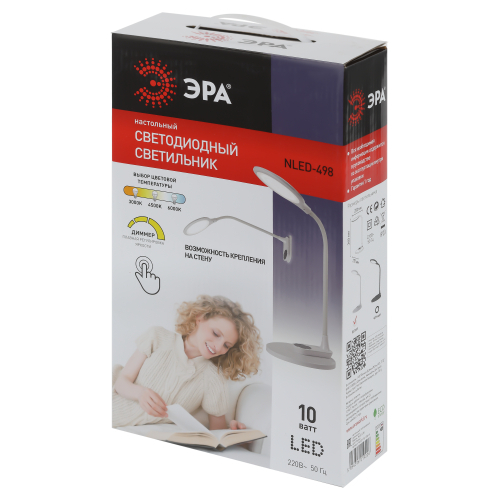 Настольный светильник ЭРА NLED-498-10W-W со светодиодами (LED) в качестве источников света. Оснащен сенсорным управлением с возможностью выбора цветовой температуры (теплый, нейтральный или холодный свет). Плавный диммер для регулировки яркости. Светильник сохраняет выбранные настройки при включении-выключении. Направление света регулируется наклоном и поворотом плафона в любом направлении. Форма плафона в виде круга обеспечивает оптимальное рассеивание света и очень удобна при мелкой ручной работе. Светильник имеет съемное основание и возможность подвеса на стену. По вашему выбору можно использовать светильник как настольный с устойчивым основанием или как съемное бра.