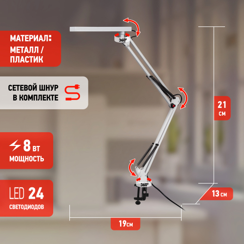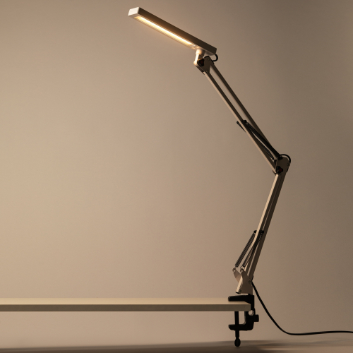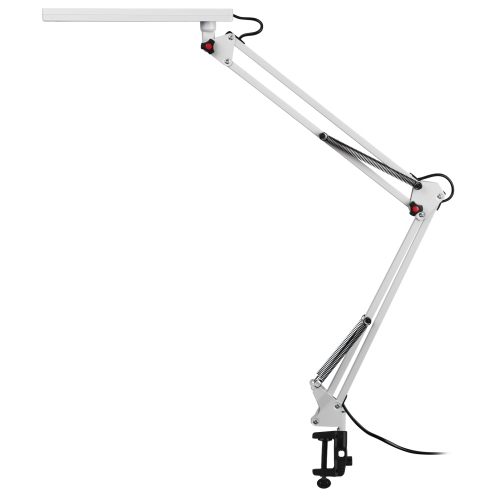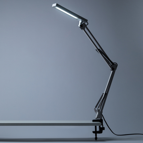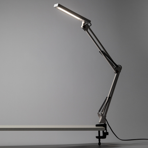 Светильник со светодиодами (LED) в качестве источников света. Модель на струбцине. Выключатель на проводе. Изменяемая цветовая температура: 3000К/4500К/6000К. Высота плафона регулируется двухсекционной сгибающейся стойкой, направление света регулируется поворотом плафона в любом направлении.