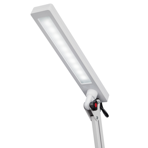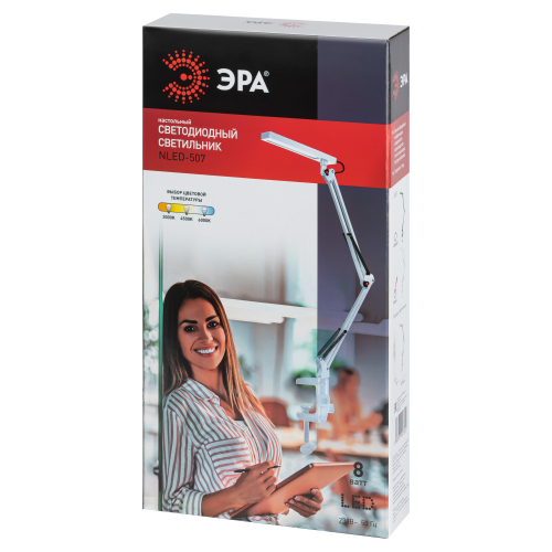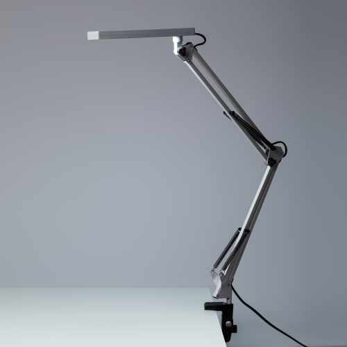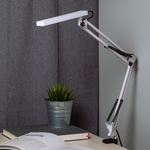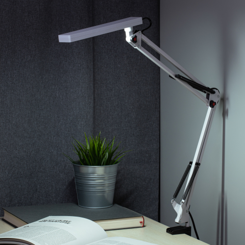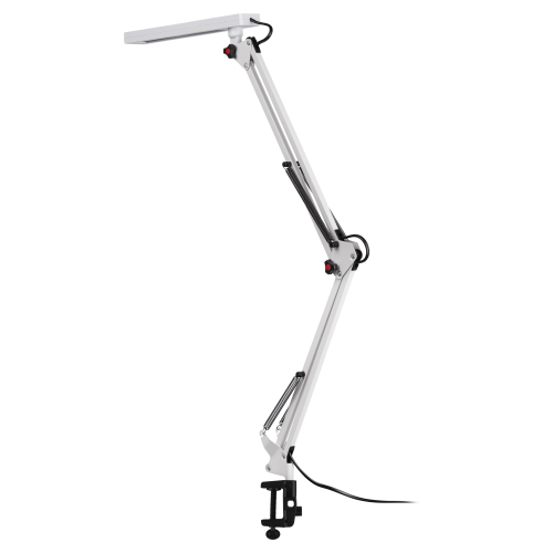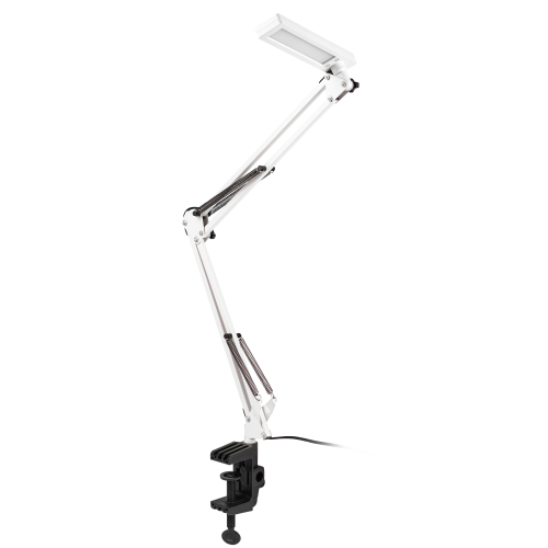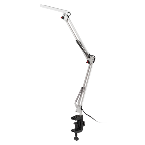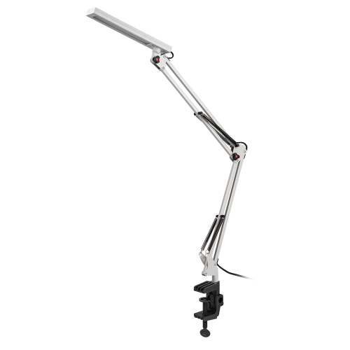 Настольный светильник со светодиодами (LED) в качестве источников света. Выбор цветовой температуры - 3 цвета: 3000К, 4500К, 6000К. Выключатель на проводе. Высота плафона регулируется двухсекционной сгибающейся стойкой. Модель на струбцине.