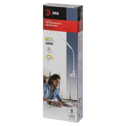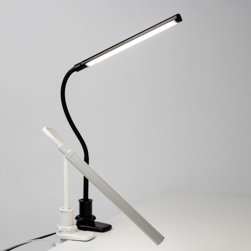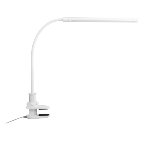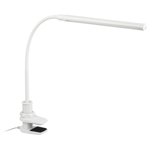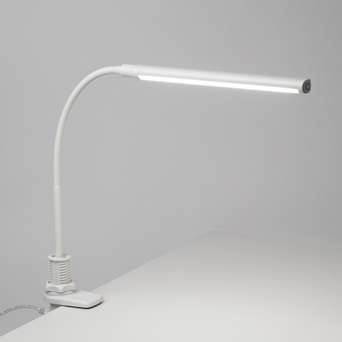 Настольный светильник со светодиодами (LED) в качестве источников света, 8 Вт. Модель на струбцине с сенсорным переключателем на плафоне. Плавная регулировки яркости. Высота плафона регулируется гибкой стойкой. Нейтральный белый свет - цветовая температура 4000К.