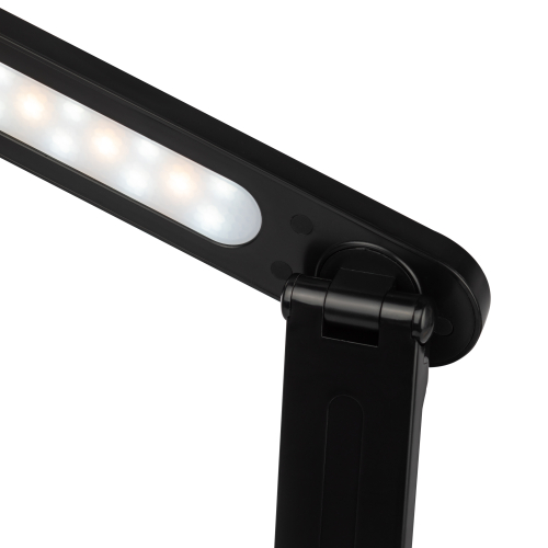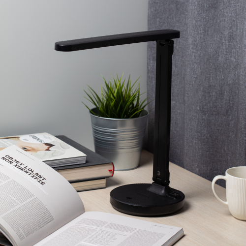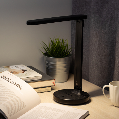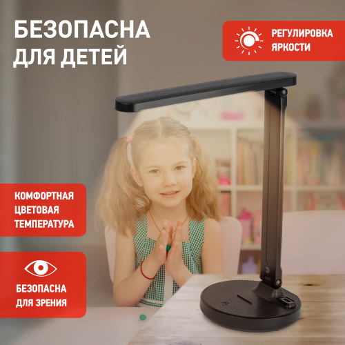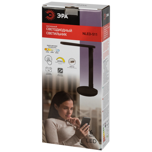 Настольный светильник ЭРА NLED-511-6W-BK со светодиодами (LED) в качестве источников света в дзайне "под кожу". Встроенный литиевый аккумулятор для автономной работы. Подзарядка от USB. USB-кабель в комплекте. Удобная складная конструкция с сенсорным управлением, возможностью выбора цветовой температуры и плавным диммером для регулировки яркости. На обратной стороне основания расположен выключатель для отключения/блокировки сенсора от случайного включения. В светильник встроена функция power bank - есть USB-порт для подзарядки устройств на основании (именно как power bank, автономно, от сети не подзаряжает). Направление света регулируется наклоном стойки и поворотом панели со светодиодами относительно стойки для максимального комфорта.