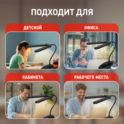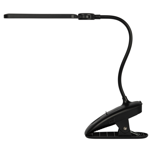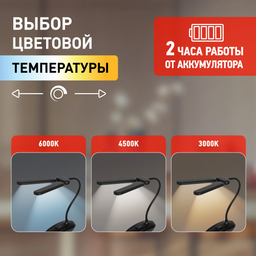 Настольный светильник с двойным плафоном со светодиодами (LED) в качестве источников света. На прищепке. Встроенный литиевый аккумулятор для автономной работы. Выбор цветовой температуры - 3 цвета: 3000К, 4500К, 6000К. Сенсорное переключение. Плавный диммер для регулировки яркости. Подзарядка от USB. USB кабель в комплекте. Гибкая стойка.