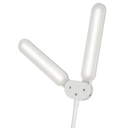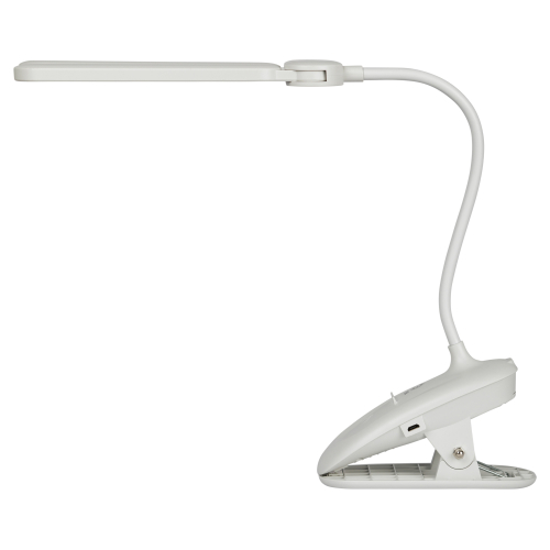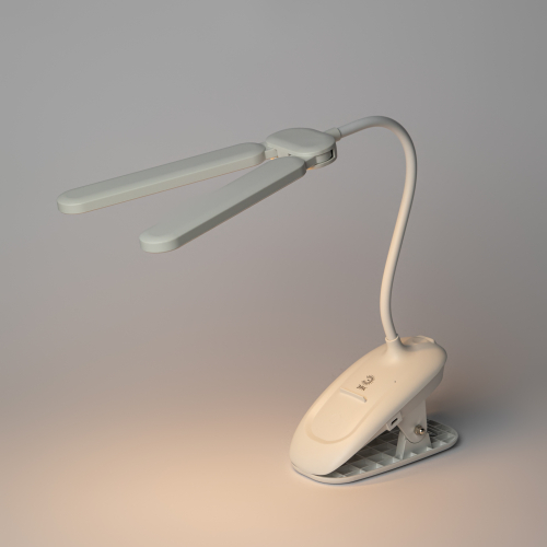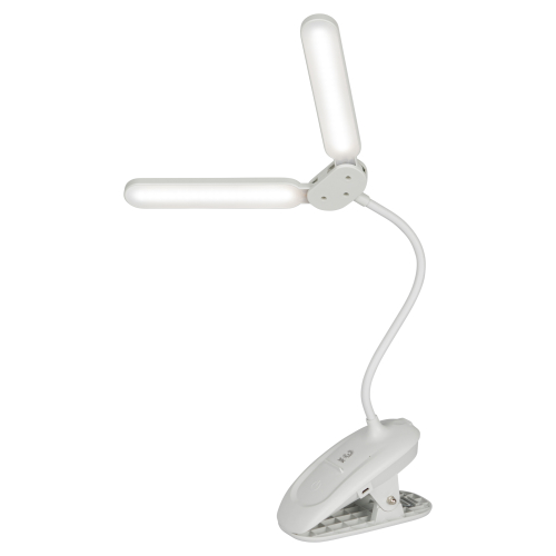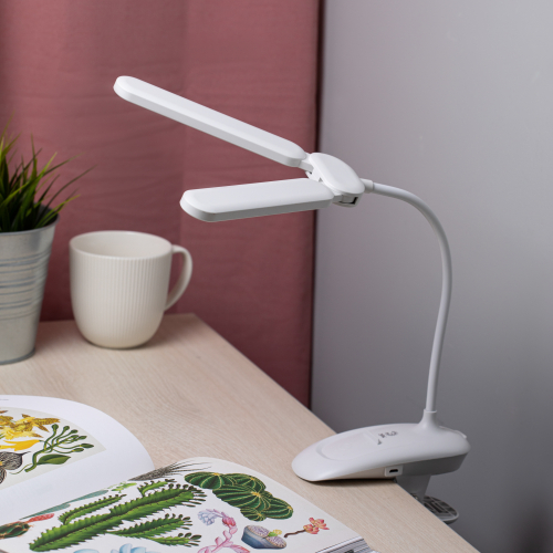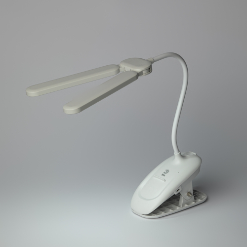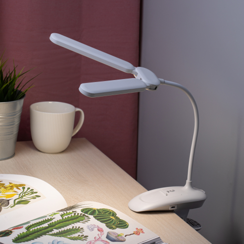 Настольный светильник с двойным плафоном со светодиодами (LED) в качестве источников света. На прищепке. Встроенный литиевый аккумулятор для автономной работы. Выбор цветовой температуры - 3 цвета: 3000К, 4500К, 6000К. Сенсорное переключение. Плавный диммер для регулировки яркости. Подзарядка от USB. USB кабель в комплекте. Гибкая стойка.
