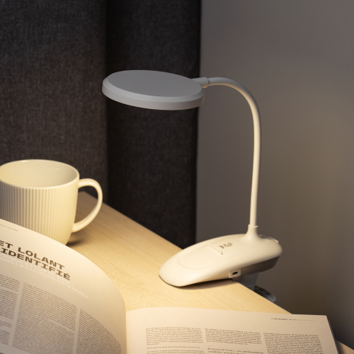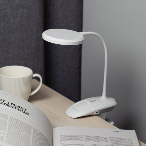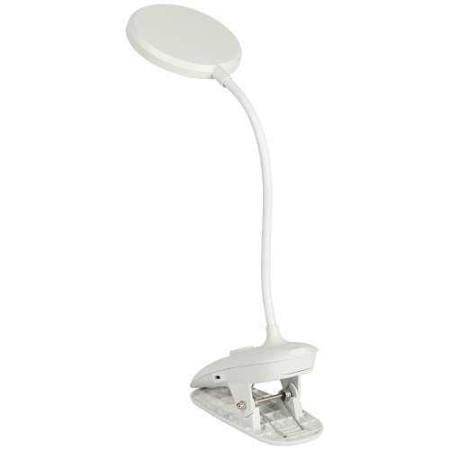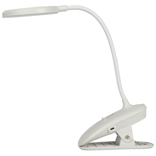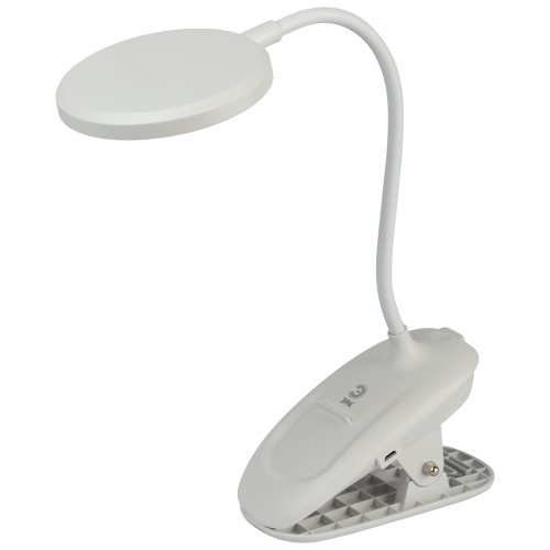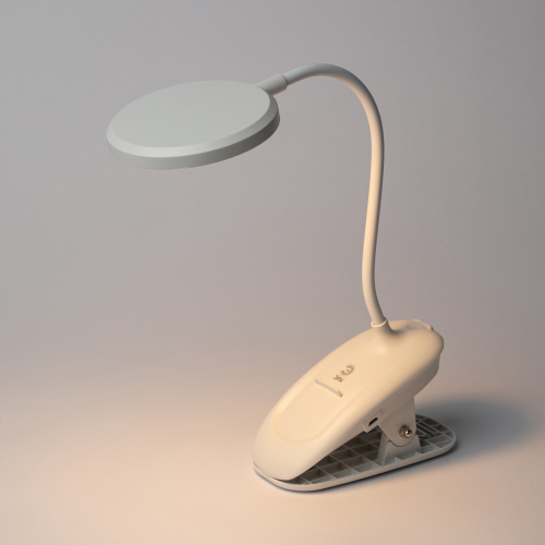 Настольный светильник со светодиодами (LED) в качестве источников света. На прищепке. Встроенный литиевый аккумулятор для автономной работы. Выбор цветовой температуры - 3 цвета: 3000К, 4500К, 6000К. Сенсорное переключение. Плавный диммер для регулировки яркости. Подзарядка от USB. USB кабель в комплекте. Гибкая стойка.