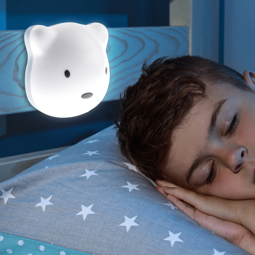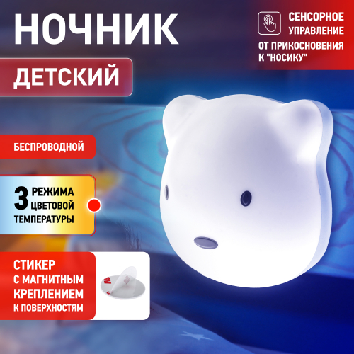 Автономный ночник, работает от встроенного литиевого аккумулятора. Подзарядка от USB, USB кабель в комплекте. Дизайн в виде мордочки медвежонка. Сенсорное переключение от прикосновения к "носику". Выбор цветовой температуры - 3 цвета: 3000К, 4500К, 6000К. Плавный диммер для регулировки яркости. Встроенное магнитное крепление для любых металлических поверхностей. Стикер с возможностью магнитного крепление к любому типу поверхностей.