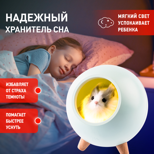 Функциональные преимущества: Светильник-ночник со светодиодами (LED) в качестве источников света. Дизайн в виде подсвечивающегося "домика" с пушистым хомячком внутри. Хомячка можно вытащить! Автономный, работает от встроенного литиевого аккумулятора. Подзарядка от USB. USB кабель в комплекте. Выключатель на корпусе. Плавная регулировка яркости при помощи сенсорной кнопки.