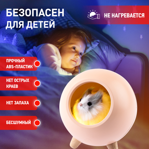 Функциональные преимущества: Светильник-ночник со светодиодами (LED) в качестве источников света. Дизайн в виде подсвечивающегося "домика" с пушистым хомячком внутри. Хомячка можно вытащить! Автономный, работает от встроенного литиевого аккумулятора. Подзарядка от USB. USB кабель в комплекте. Выключатель на корпусе. Плавная регулировка яркости при помощи сенсорной кнопки.