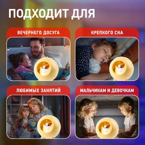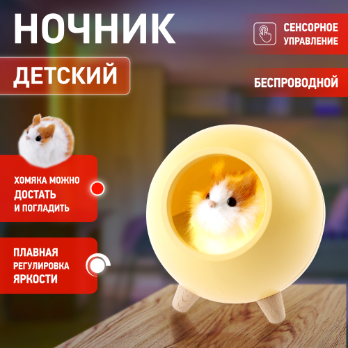 Функциональные преимущества: Светильник-ночник со светодиодами (LED) в качестве источников света. Дизайн в виде подсвечивающегося "домика" с пушистым хомячком внутри. Хомячка можно вытащить! Автономный, работает от встроенного литиевого аккумулятора. Подзарядка от USB. USB кабель в комплекте. Выключатель на корпусе. Плавная регулировка яркости при помощи сенсорной кнопки.