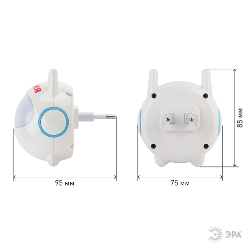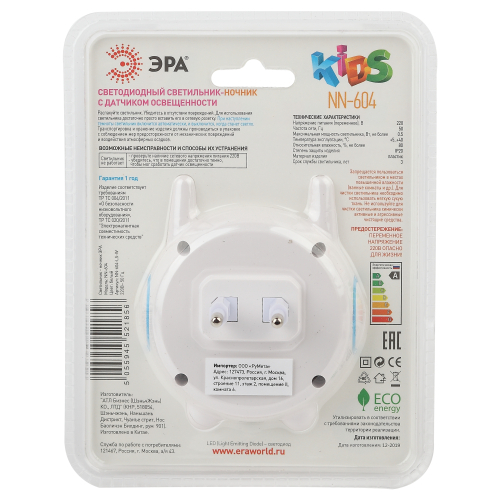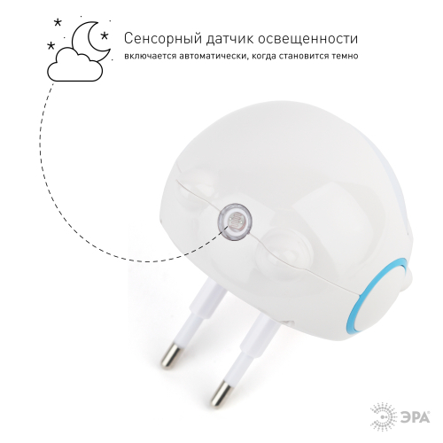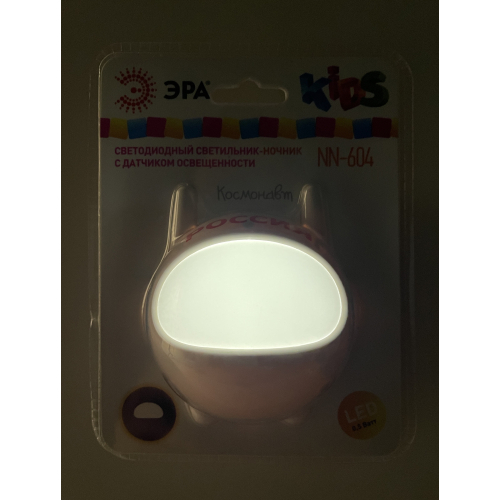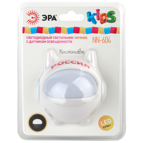 Ночник NN-604-LS-W "Космонавт" с надписью "РОССИЯ" со светодиодами (LED) в качестве источников света и встроенным датчиком освещенности. Включается автоматически, если вокруг темно, и так же сам гаснет с рассветом. Среди множества вариантов ночников миниатюрные модели, вставляющиеся в розетку - одни из самых удобных. Светодиодные ночники ЭРА успешно выполняют свою основную функцию - создают мягкий рассеянный свет. Они отличаются мизерным энергопотреблением, которое будет незаметно в общем счете за электроэнергию. При необходимости можно смело оставлять их включенными ночи напролет. Современная LED технология исключает пульсации света, освещение ровное и приглушенное - то, что нужно для комфортного сна или ночной подсветки. Упаковка позволяет проверить работу ночника светодиодного, не доставая его из блистера, нужно только включить его в розетку и прикрыть датчик освещенности рукой.