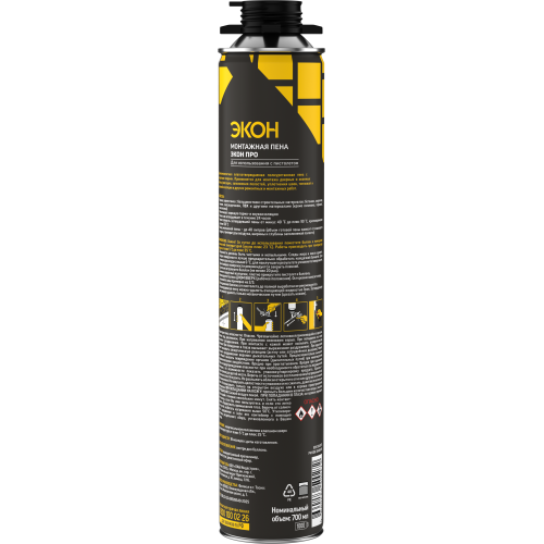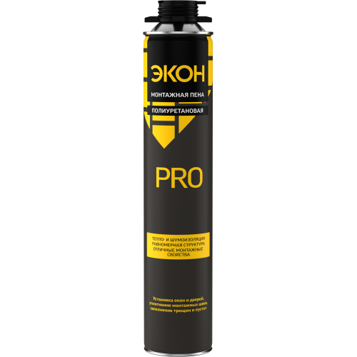 Монтажная пена ЭКОН Профессиональная всесезонная представляет собой готовую к применению однокомпонентную полиуретановую пену, затвердевающую под воздействием влажности воздуха. Пена - саморасширяющийся продукт, увеличивающийся в процессе застывания в два раза. ЭКОН имеет прекрасную адгезию к дереву, бетону, камню, металлу и т.д. Поверхность может быть влажной, но не замерзшей и покрытой льдом. Выход главным образом зависит от рабочих условий — температуры, влажности воздуха, доступного для расширения пространства и т.д. Свойства: • Прекрасная адгезия ко многим материалам • Высокая тепло- и звукоизоляция • Устойчивость к влажности • Устойчивость к старению • Защита от УФ-излучения