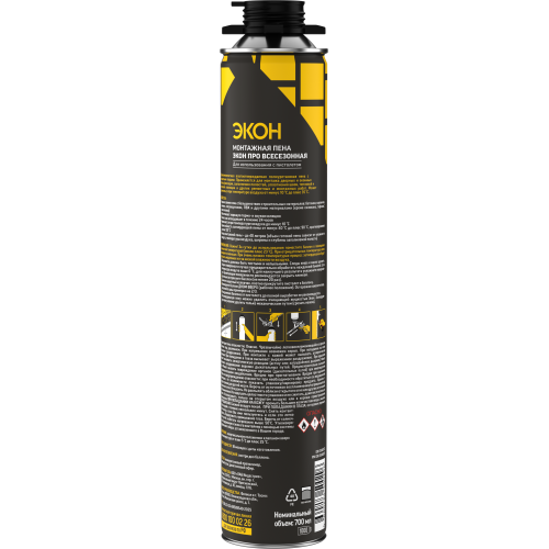 Профессиональная монтажная всесезонная пена представляет собой готовую к применению однокомпонентную полиуретановую пену, затвердевающую под воздействием влажности воздуха. Пена - саморасширяющийся продукт, увеличивающийся в процессе застывания в два раза. Экон имеет прекрасную адгезию к дереву, бетону, камню, металлу и т.д.