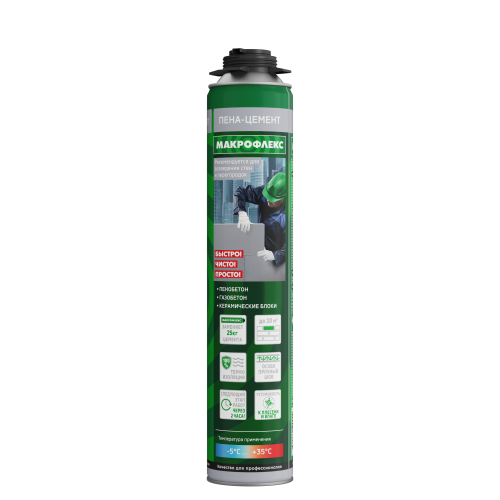 Готовый к применению твердеющий под воздействием влаги сверхэффективный инструмент для быстрого возведения стен-перегородок из строительных блоков. Благодаря этому инновационному продукту больше не понадобятся тяжелые мешки, дополнительное оборудование, вода и энергия. Пена-цемент позволяет выполнить работу значительно меньшими усилиями и помогает вдвое сократить затрачиваемое на работу время. Заменяет 25 кг цемента или сухого клея. Производительность до 10 кв.м кладки из одного баллона. 100% термоизоляция (отсутствие мостков холода). Высокая адгезия к минеральным основаниям. Превосходная адгезия к большинству строительных материалов. Особо прочный шов (высокая прочность сцепления). Следующий этап работ возможен уже через 2 часа. Использование при низкой температуре и высокой влажности. Внутреннее и наружное применение. Устойчивость к плесени и влаге. Температура окружающей среды при применении - от -5C до +35C.