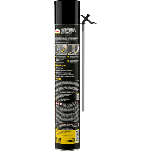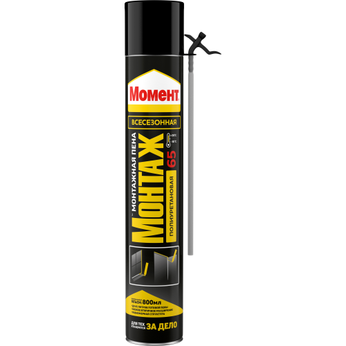 Монтажная пена Момент Монтаж 65 Всесезонная Стандартная представляет собой готовую к применению однокомпонентную полиуретановую пену, затвердевающую под воздействием влажности воздуха. Оснащена турбонасадкой, увеличивающей выход пены из баллона до 35%. Применяется при температуре воздуха до −10оС.