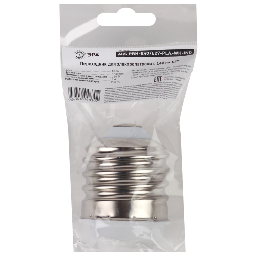 переходник E40-E27 изготавливается из термостойкого пластика, материал химически устойчивый к агрессивным средам, обладает высокой прочностью и теплостойкостью.