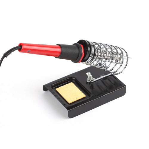 Паяльник легко и удобно умещается в направляющую закреплённую на устойчивой штампованной платформе с ложементом под губку. Губка для очистки жала от припоя идёт в комплекте.