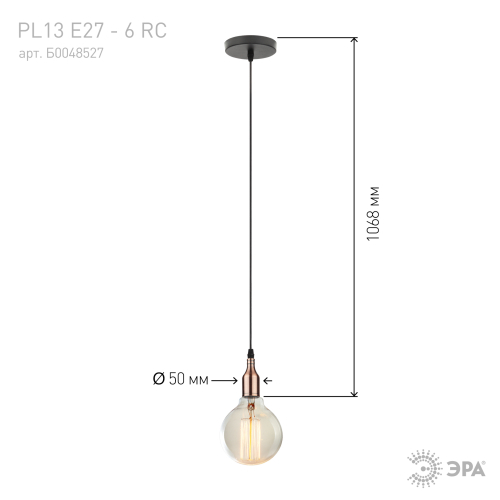 Светильник подвесной PL13 E27 - 6 RC является универсальным источником света, легко монтируется и демонтируется в потолок. Создает неповторимый дизайн и уют в помещении. Подходит для спален, гостинной, столовой и других комнат. Цоколь для источника света E27, напряжение питания 220В ~50/60Гц, материал алюминий, цвет светильника медь, размер плафона H45*D100+1000 длинна провода, максимальная мощность лампы 50 Вт, степень защиты IP20