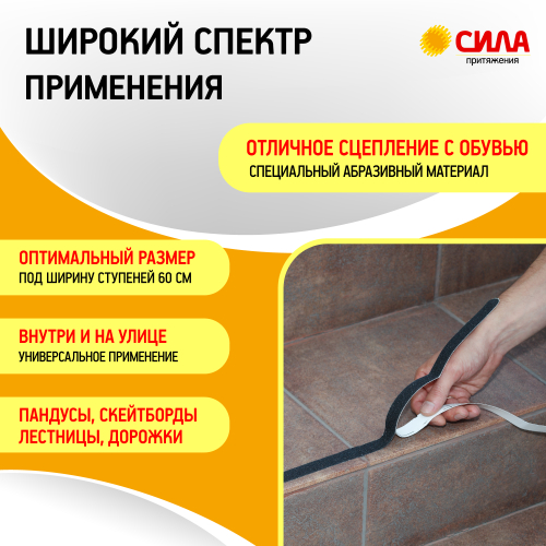 Оптимальный размер под размер ступни 60 см. Количество полосок в упаковке 6 штук. Перед нанесением противоскользящих полосок поверхность, на которую они будут наноситься, необходимо почистить и просушить, обязательно обезжирить спиртом или растворителем. Далее необходимо удалить защитную подложку с клеящего слоя и крепко прижать полоску к поверхности.