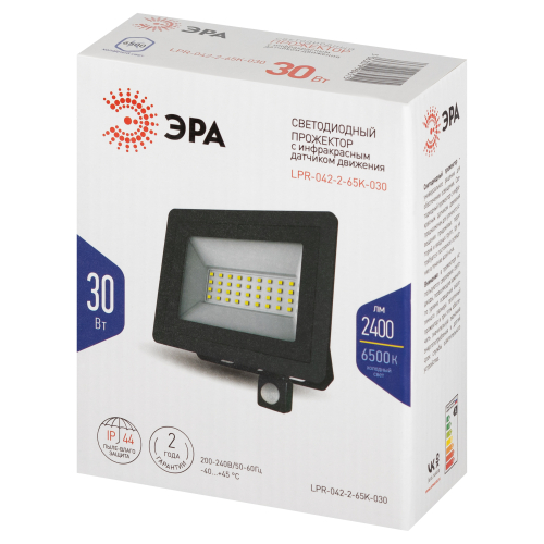 LED-прожектор серии ЭРА LPR-042-2 с регулируемым инфракрасным датчиком движения. Настраивать можно следующие параметры: временной интервал освещения (от 5 секунд до 8 минут), чувствительность к движению (расстояние 1 — 8 метров), чувствительность ко времени суток (световой поток 5 — 2000 лк). Датчик имеет поворотную конструкцию.