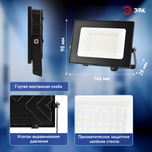 Профессиональный светодиодный прожектор ЭРА PRO LPR-062. Энергоэффективность — 100 лм/Вт, эффективная работа при низких температурах, повышенная защита от влаги. Мощность — 30 Вт. Световой поток — 3000 лм. Длина кабеля — 15 см.