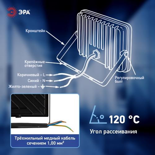 Данный LED-прожектор мощностью 70 Вт имеет световой поток 7000 лм. Длина провода — 25 см. Гнутая монтажная скоба для быстрого монтажа. Имеется клапан выравнивания давления.