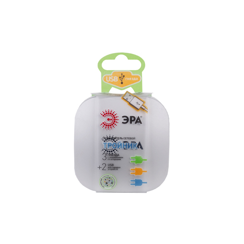 Тройник (адаптер) ЭРА с 3-мя розетками и 2-мя USB гнездами для зарядки портативных устройств. Идеален для зарядки мобильных телефонов и планшетов. Незаменим с собой в дороге. Особенно актуален когда в помещении мало источников подключения - можно из одной розетки сделать три и при этом ещё заряжать 2 устройства одновременно через USB. Максимальная мощность USB разъемов: 2100 мА. Разработан в России.