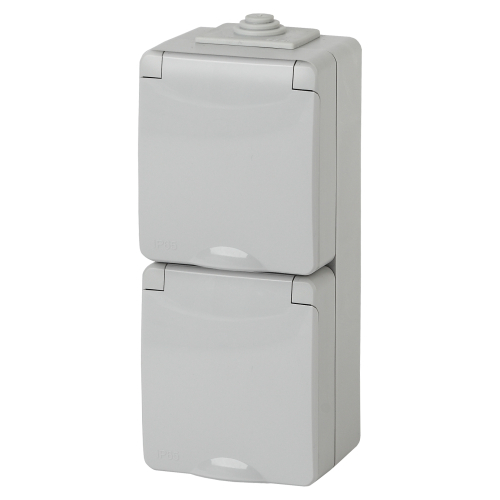 Розетка 2х2P+E верт. IP65, шторки, 16АХ-250В, ОУ, Эра Эксперт, серый.