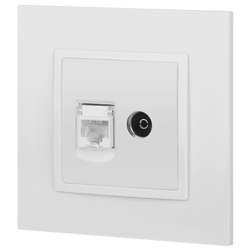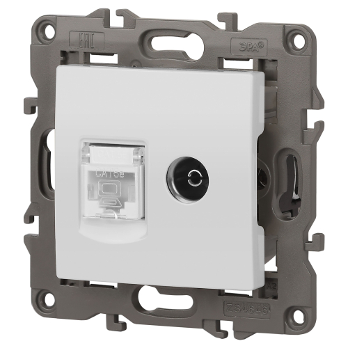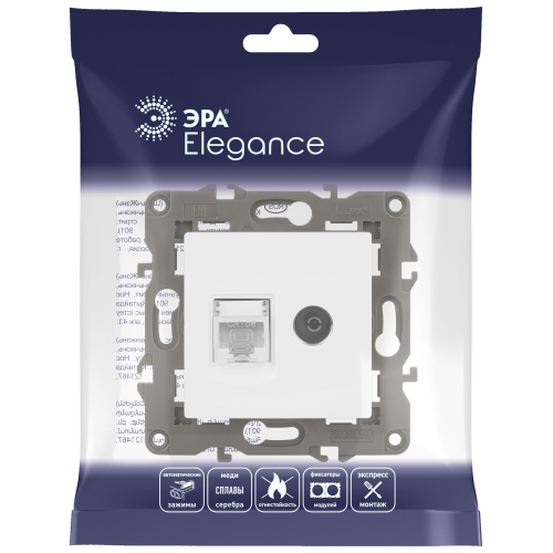 Розетка телевизионная + интернет серии Эра Elegance цвет белый 14-3110-01. Рамки приобретаются отдельно. Рамки Эра Elegance ПЛАСТИК: 1 пост 14-5001-хх, 2 поста 14-5002-хх, 3 поста 14-5003-хх, 4 поста 14-5004-хх, 5 постов 14-5005-хх; СТЕКЛО: 1 пост 14-5101-хх, 2 поста 14-5102-хх, 3 поста 14-5103-хх, 4 поста 14-5104-хх; МЕТАЛЛ: 1 пост 14-5201-хх, 2 поста 14-5202-хх, 3 поста 14-5203-хх, 4 поста 14-5204-хх; ДЕРЕВО: 1 пост 14-5301-хх, 2 поста 14-5302-хх, 3 поста 14-5303-хх, 4 поста 14-5304-хх (хх - код цвета: 00-прозрачный, 01-белый, белёный дуб, 02-слоновая кость, 03-алюминий, 04-шампань, 05-чёрный, чёрное дерево, 07-ясень, 09-дуб, 10-венге, 11-клён, 14-медь, 21-жёлтый, 22-оранжевый, 23-красный, 25-бордо, 26-лайм, 27-зелёный, 28-голубой, 29-синий, 30-розовый, 31-мокко, 32-серый, 41-сталь, 42-титан).