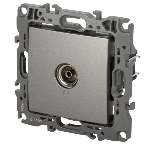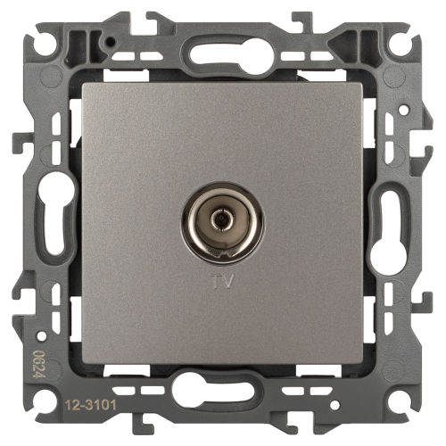 Розетка телевизионная одиночная серии Эра 12 скрытой установки механизм цвет титан 12-3101-16. Сделана из поликарбоната. Монтаж в подрозетник производится и на лапки, и на винты. Рамки приобретаются отдельно.