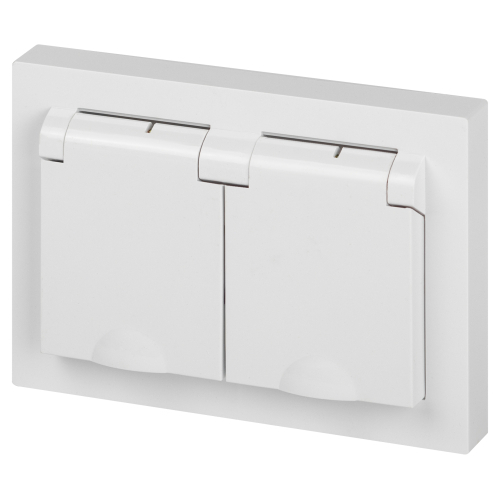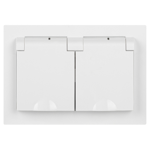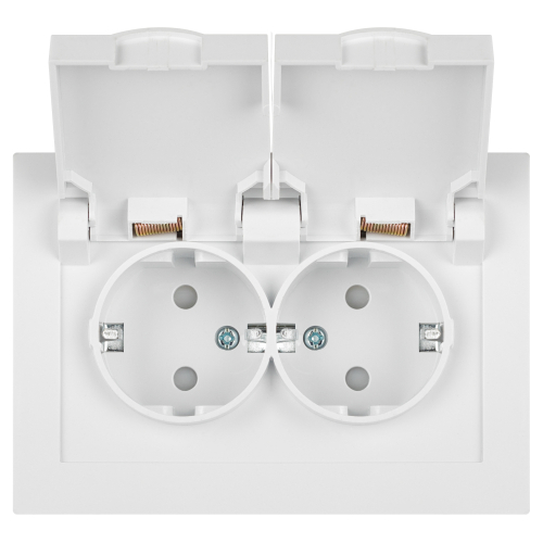 Розетка двойная с заземлением с крышкой со шторками IP44 серии Intro Accent скрытой установки цвет белый 6-210-01. Номинальные характеристики 16А 250В. Выполнена из негорючего термопласта, оснащена винтовыми клеммами. Парные клеммы обеспечивают соединение шлейфом. Монтаж в подрозетник производится и на лапки, и на винты.