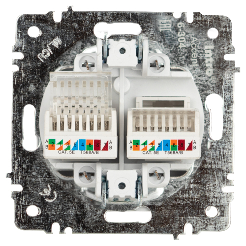 Розетка информационная двойная серии Intro Accent скрытой установки механизм цвет белый 6-304-01. Выполнена из негорючего термопласта. Монтаж в подрозетник производится и на лапки, и на винты. Рамка приобретается отдельно. В серии представлены рамки до 5 постов: на 1 пост - 6-501-хх, на 2 поста - 6-502-хх, на 3 поста - 6-503-хх, на 6 поста - 4-504-хх, на 5 постов - 6-505-хх (где хх - цветовой код: 01 - белый, 01М - матовый белый, 02 - слоновая кость, 03 - алюминий, 04 - шампань, 05 - антрацит, 06 - перламутр, 07 - графит, 08 - бронза, 09 - титан, 10 - венге, 11 - сосна)