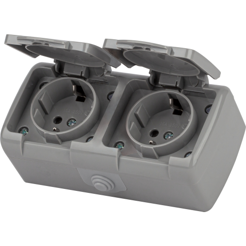 Розетка 2х2P+E Schuko, 16А-250В, IP54, ОУ, Atlantic, серый
