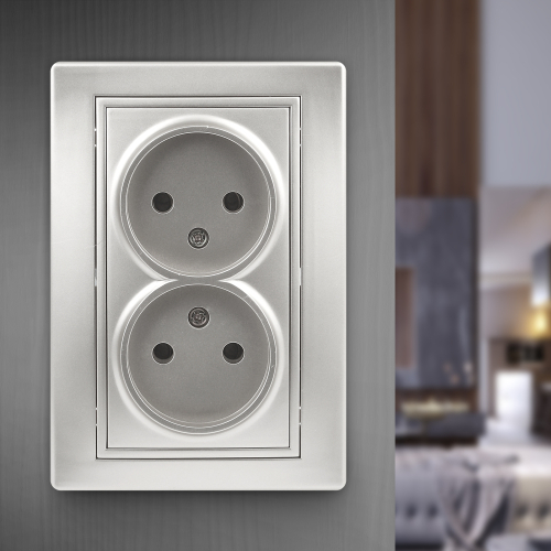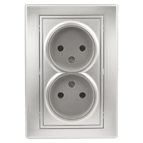 Розетка двойная 2-я серии Intro Plano скрытой установки цвет алюминий 1-204-03. Номинальные характеристики 16А 250В. Розетка выполнена из керамики, укомплектована одноместной рамкой, оснащена винтовыми клеммами. Клеммы с двумя отверстиями позволяют соединять соседние розетки шлейфом. Установка в подрозетник производится как на монтажные лапки, так и на винты.