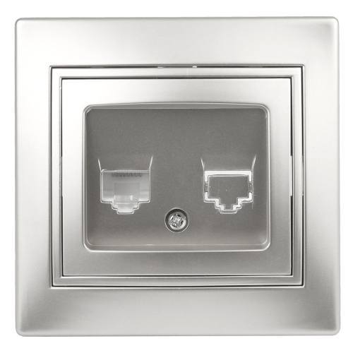 Розетка RJ11 серии Intro Plano скрытой установки цвет алюминий 1-302-03. Номинальные характеристики . Розетка выполнена из термопласта, укомплектована одноместной рамкой. Для установки 2-х и более устройств в несколько подрозетников в ряд дополнительно используются многоместные рамки: 2-х постовая - 1-502-хх, 3-х постовая 1-503-хх, 4-х постовая - 1-504-хх (где хх - цветовой код: 01 - белый, 02 - слоновая кость, 03 - алюминий, 04 - шампань, 05 - антрацит, 10 - венге, 11 - сосна).