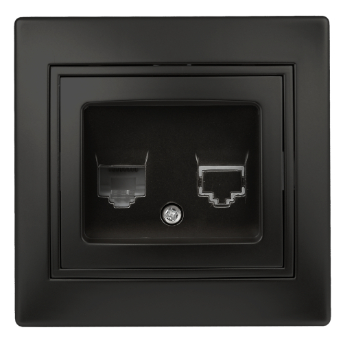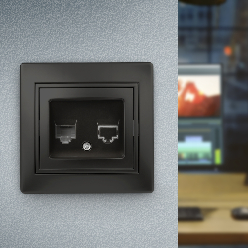 Розетка RJ11 серии Intro Plano скрытой установки цвет антрацит 1-302-05. Номинальные характеристики . Розетка выполнена из термопласта, укомплектована одноместной рамкой. Для установки 2-х и более устройств в несколько подрозетников в ряд дополнительно используются многоместные рамки: 2-х постовая - 1-502-хх, 3-х постовая 1-503-хх, 4-х постовая - 1-504-хх (где хх - цветовой код: 01 - белый, 02 - слоновая кость, 03 - алюминий, 04 - шампань, 05 - антрацит, 10 - венге, 11 - сосна).