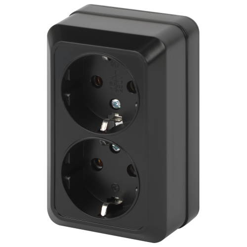 Розетка двойная с заземлением серии Intro Quadro открытой установки цвет антрацит 2-204-05. Номинальные характеристики 16А 250В. Розетка выполнена из керамики, стали и латуни, оснащёна винтовыми зажимами.