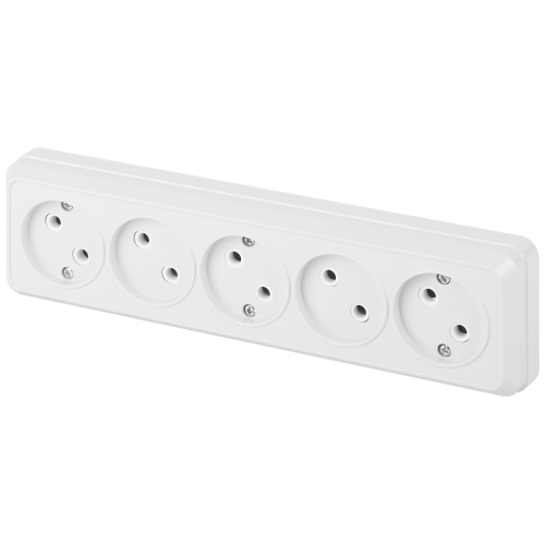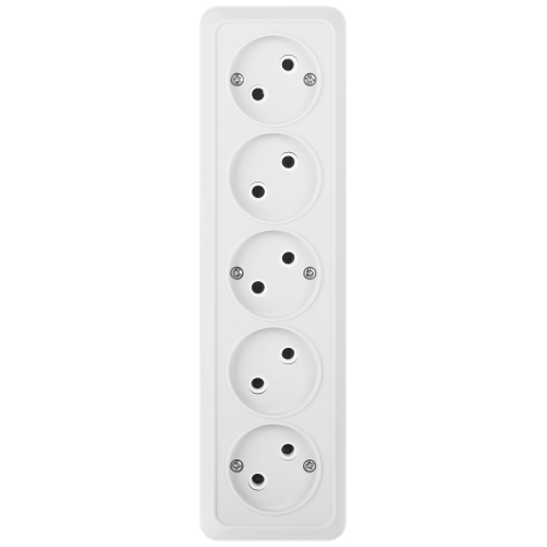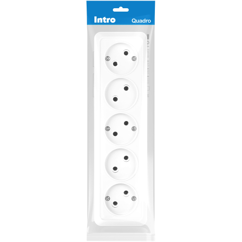Розетка Intro Quadro 2-209-01пятиместная без заземлением 5х2P, 16А-250В, IP20, открытой установки, цвет белый. Материал термопласт.