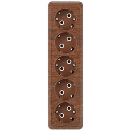 Розетка пятиместная с заземлением серии Intro Quadro открытой установки цвет венге 2-210-10. Номинальные характеристики 16А 250В. Выполнена из негорючего термопласта, оснащена винтовыми зажимами.