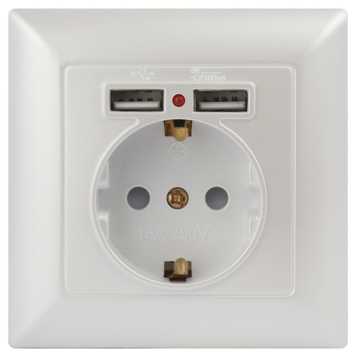 Розетка с USB со шторкой серии Intro Solo скрытой установки цвет перламутр 4-410-06 с заземлением. Номинальные характеристики 16А 250В/2,1А-5В . Розетка выполнена из негорючего термопласта, укомплектована одноместной рамкой, оснащена винтовыми клеммами. Клеммы с двумя отверстиями позволяют соединять соседние розетки шлейфом. Установка в подрозетник производится как на монтажные лапки, так и на винты.