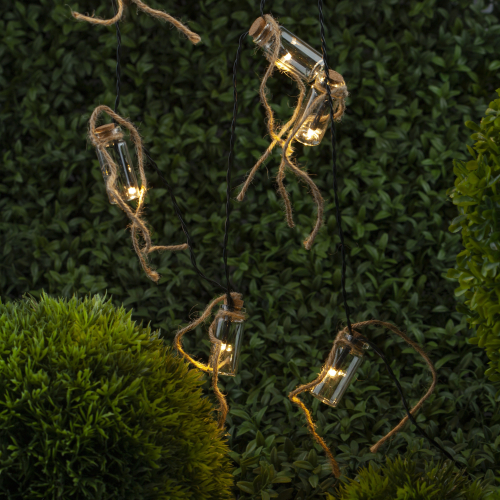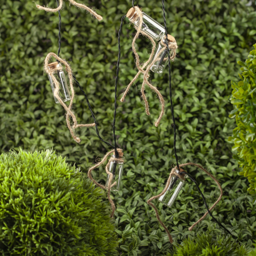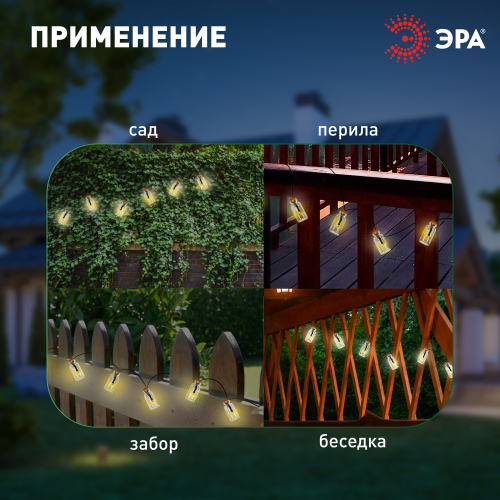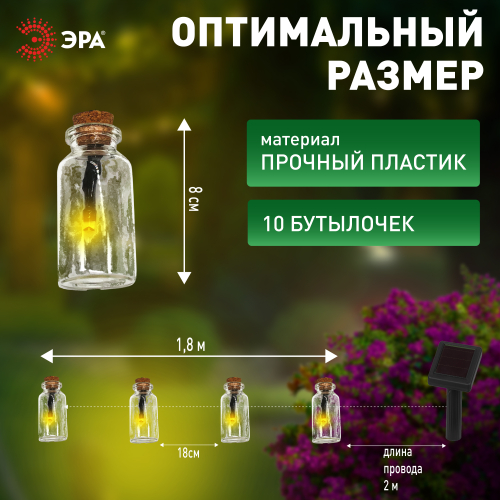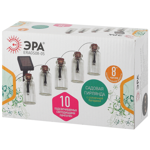 Уличная светодиодная гирлянда ERAGS08-05 в виде миниатюрных стеклянных баночек с пробковыми крышками станет экзотическим украшением Вашего участка. Простая установка и большая длина в 3,8 м позволят Вам расположить украшение в саду, подсветить кустарники, цветы, аллею или вход в террасу. 10 пластиковых лампочек изящно соединены между собой. LED светильник функционирует на солнечной батарее. Данный вид получения энергии является самым экологичным, энергоемким, а также бесшумным Питание происходит во включенном режиме, в дневное время. С наступлением темноты маленькие бутылочки загораются теплым желтым светом. Создается настоящая атмосфера волшебства, кажется, что внутри каждой фигурки сидит маленький светлячок. Необычная форма в виде бутылочек придает гирлянде причудливый стиль. Солнечная батарея предусматривает 8 часов непрерывной работы. 2 режима позволят настроить освещение по настроению. Высокая степень защиты от пыли и влаги позволяет оставлять устройство на улице даже во время дождя. Обращаем Ваше внимание, что перед использованием фигурки её необходимо включить и зарядить. Светильник заряжается в течение всего светового дня. Декоративная уличная гирлянда на солнечной батарее ERAGS08-05 ЭРА прекрасный вариант для создания уюта на территории.