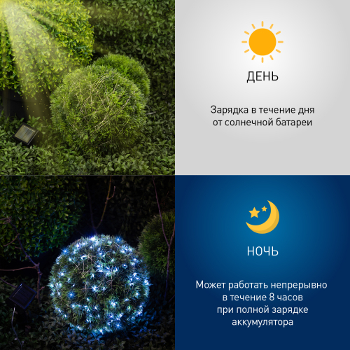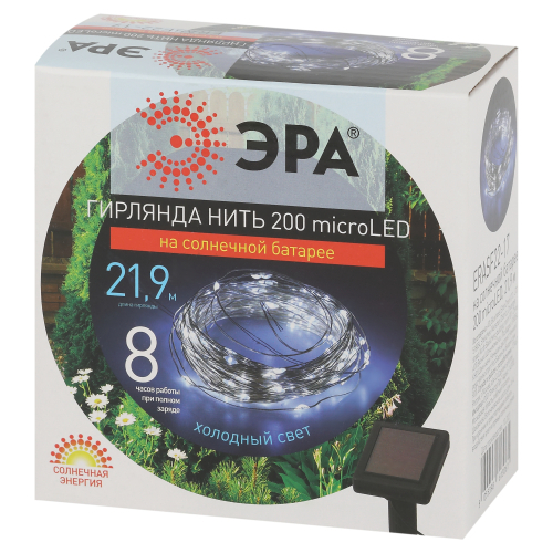 Садовая гирлянда ERASF22-17 Нить 21.9 м от компании ЭРА позволит украсить Ваш дачный участок или частный дом и расставить акценты! Эта уличная светодиодная гирлянда добавит атмосферу праздника - нарядите ей елку, кустарник, беседку, выделите ветви дерева или окно дома. Состоит из 200 microLED - маленьких светодиодов с холодным свечением. Гирлянда работает на солнечной батарее - данный способ получения энергии является очень экологичным, энергоемким, а также бесшумным. Питание происходит во включенном режиме, днем, а с наступлением темноты гирлянда автоматически включается, чтобы радовать Вас до 8 часов своим светом. Есть 2 режима - постоянный и мигающий - выбирайте под настроение. Садовый светильник может работать на улице в плохую погоду, благодаря высокой степени пыле- и влагозащиты IP44, убирать его не нужно. Уличная гирлянда на солнечной батарее ЭРА позволит сделать Вашу территорию уникальной и яркой!