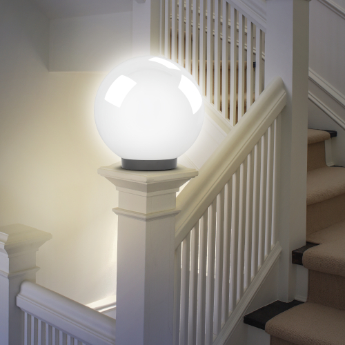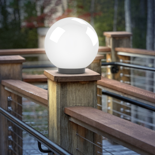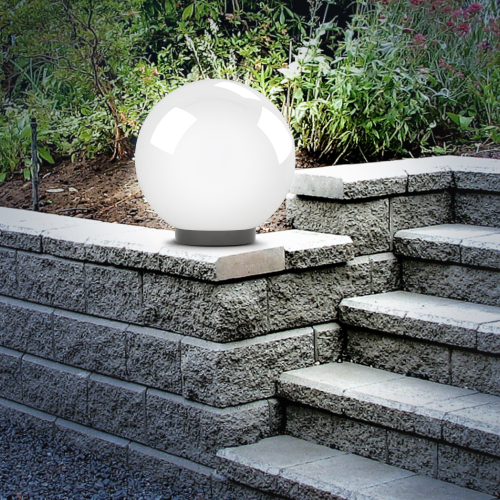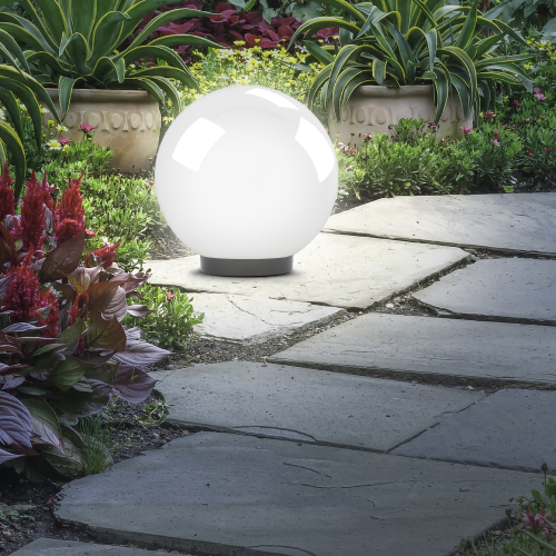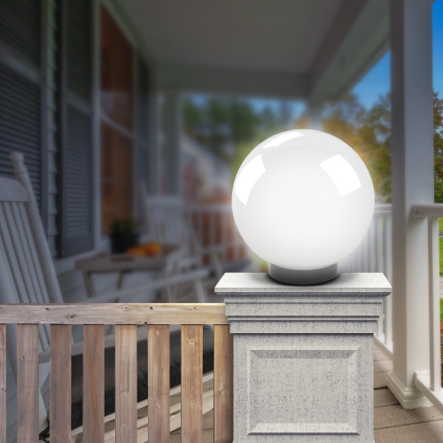 Дизайн с учетом европейских тенденций в освещении. Не подвержен коррозии, деформации под воздействием погодных условий (основание выполнено из поликарбоната, рассеиватель- полиметилметакрилата). Подходит любая светодиодная лампа, имеющая габариты не более D118мм, H=«D шара»-30мм
