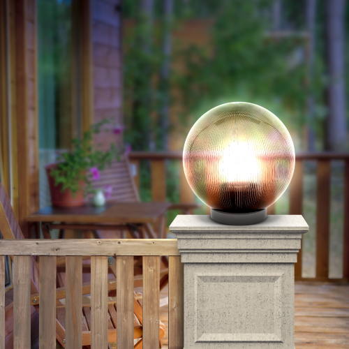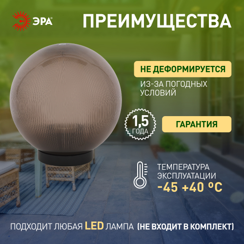 Дизайн с учетом европейских тенденций в освещении. Не подвержен коррозии, деформации под воздействием погодных условий (основание выполнено из поликарбоната, рассеиватель- полиметилметакрилата). Подходит любая светодиодная лампа, имеющая габариты не более D118мм, H=«D шара»-30мм