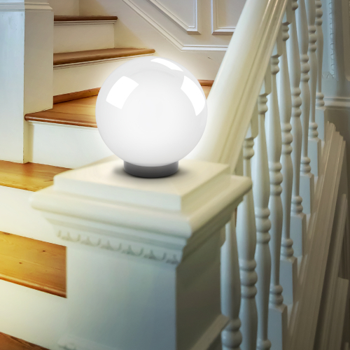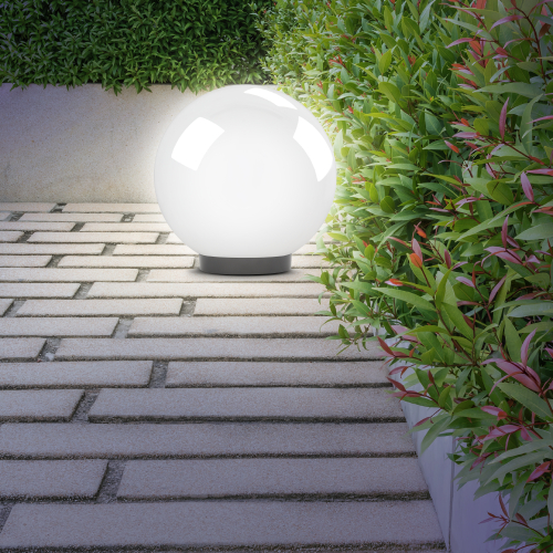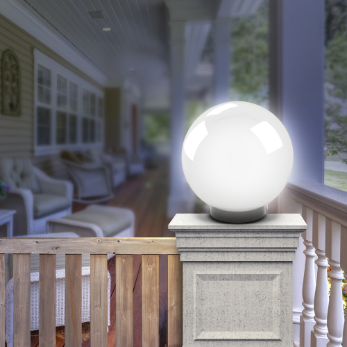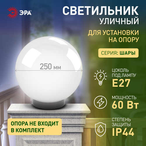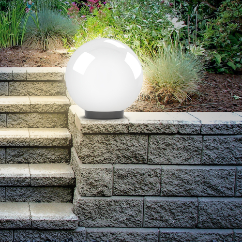 Дизайн с учетом европейских тенденций в освещении. Не подвержен коррозии, деформации под воздействием погодных условий (основание выполнено из поликарбоната, рассеиватель- полиметилметакрилата). Подходит любая светодиодная лампа, имеющая габариты не более D118мм, H=«D шара»-30мм