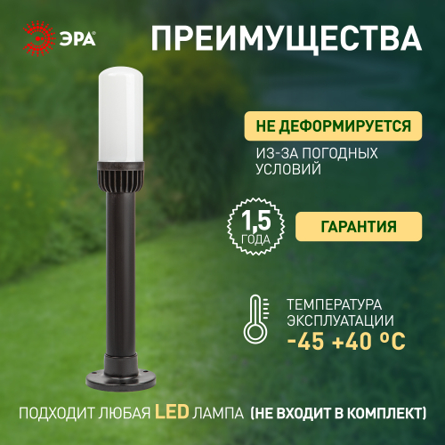 Уличный напольный светильник ЭРА под лампу с цоколем Е27 (60 Вт) - практичный и эстетичный вариант для оформления садово-парковых зон, прогулочных дорожек, придомовых территорий, фасадов.