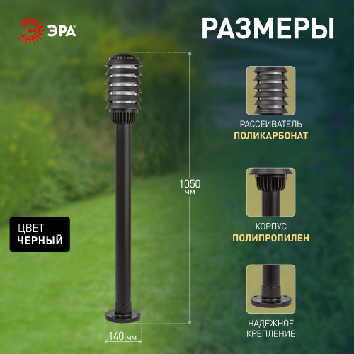 Уличный напольный светильник ЭРА под лампу с цоколем Е27 (60 Вт) - практичный и эстетичный вариант для оформления садово-парковых зон, прогулочных дорожек, придомовых территорий, фасадов.